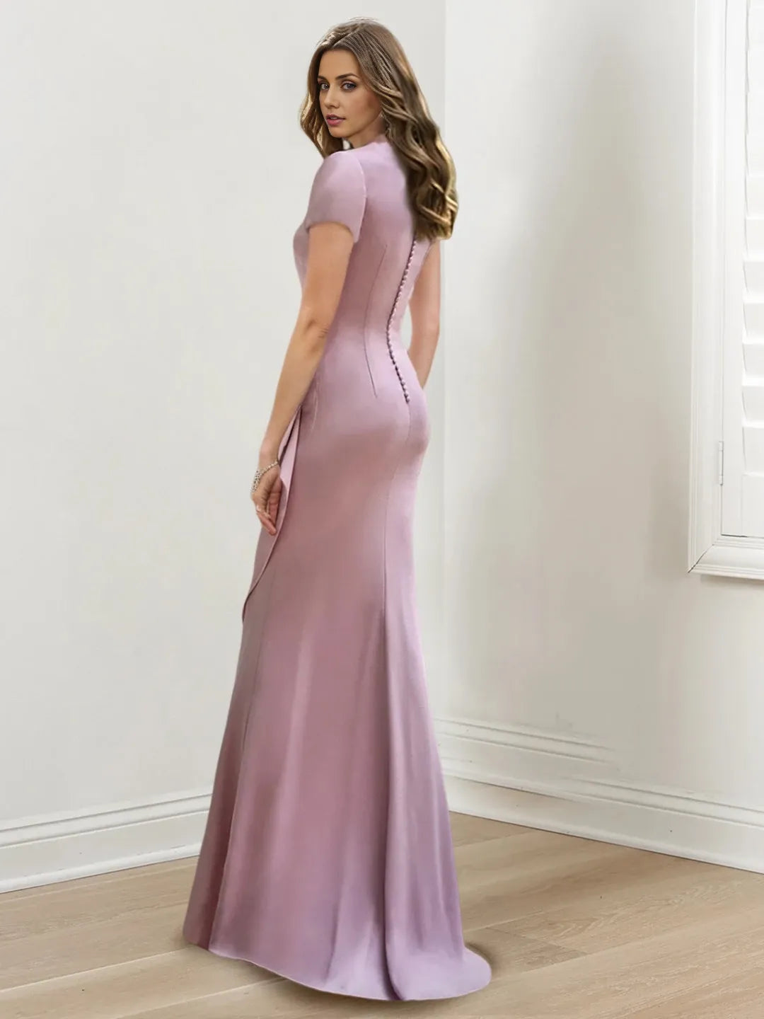 This satin mermaid gown features a floor-length silhouette that elegantly contours the body, complemented by a flattering V-neckline and delicate ruffled short sleeves. The side split adds a touch of allure while ensuring ease of movement, making it an ideal choice for the mother of the bride seeking both sophistication and comfort on the special day.