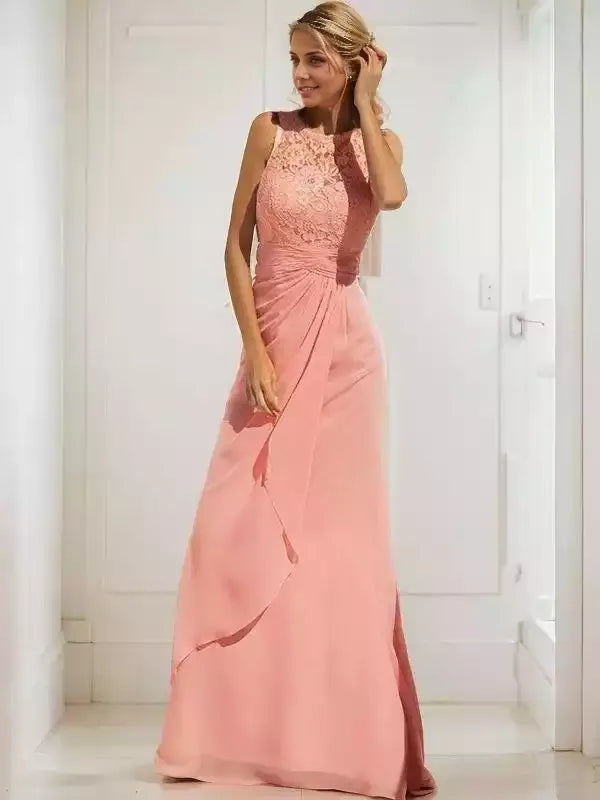 This sheath dress combines delicate chiffon and intricate lace for an elegant, floor-length silhouette. Featuring a flattering scoop neckline and sleeveless design, it offers both comfort and sophistication, making it an ideal choice for the mother of the bride seeking timeless style on the special day.