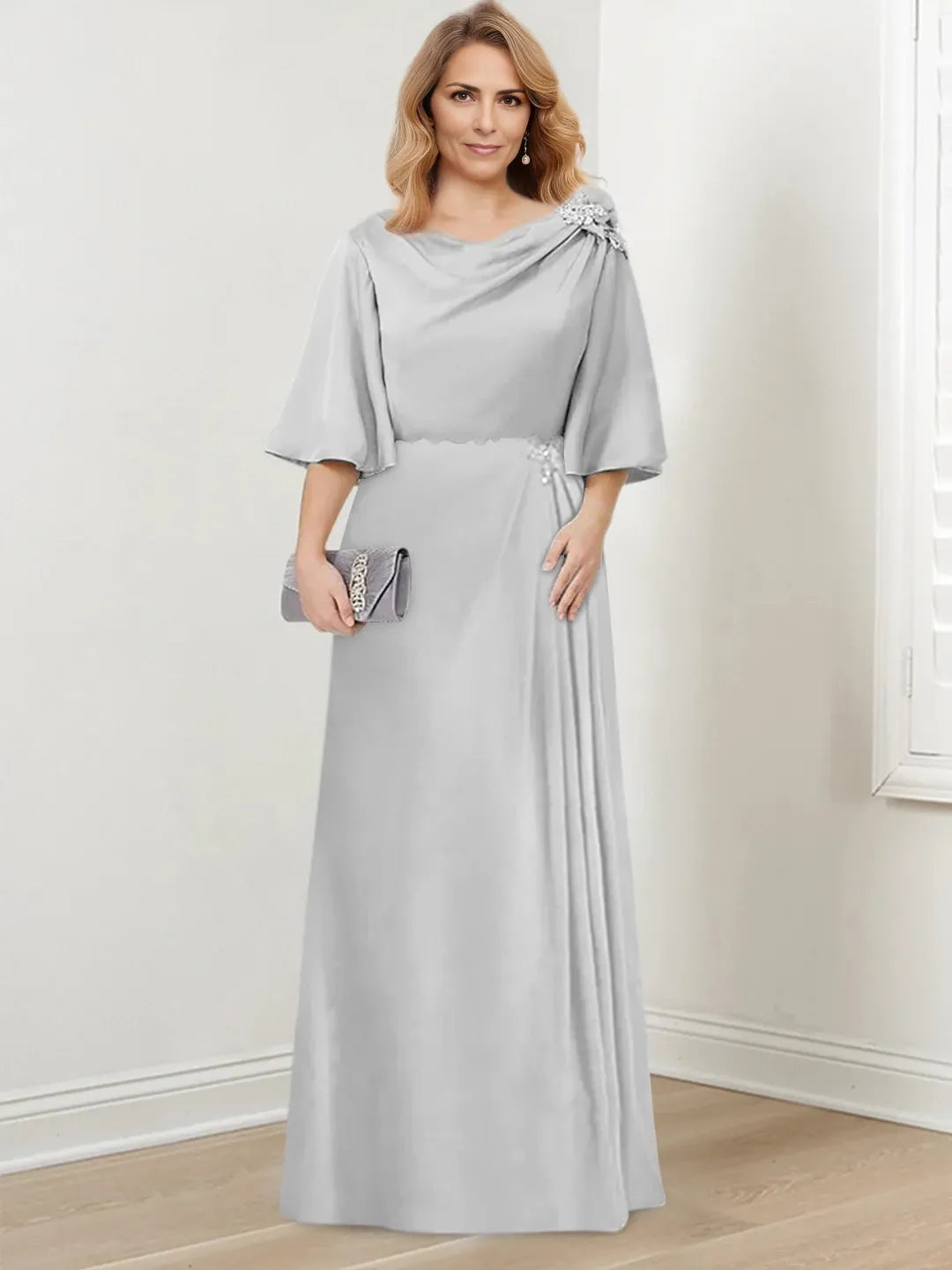 This elegant mother of the bride dress features a timeless A-line silhouette with a flattering scoop neckline and long sleeves, offering both comfort and sophistication. The floor-length design is enhanced with delicate ruffles, adding subtle movement and grace. Perfect for formal occasions, this dress combines classic style with refined details to ensure a polished and graceful appearance.