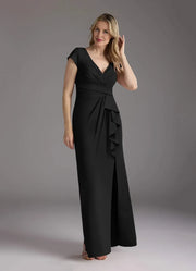 sophisticated dress features a sheath silhouette, offering a sleek and refined look. The V neckline exudes elegant charm, while the cap sleeves add a touch of understated grace. The zipper back ensures a secure fit, and the floor length skirt with a slit and ruffle detailing creates a truly sophisticated and unforgettable style, perfect for mother of the bride occasions.