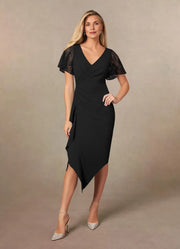 stylish dress features a sheath silhouette, offering a sleek and figure - hugging look. The V neckline exudes elegant charm, while the lace flutter sleeves add a touch of delicate romance. The zipper back ensures a secure fit, and the asymmetrical length skirt with ruffle detailing creates a truly stylish and unforgettable style, perfect for mother of the bride occasions.