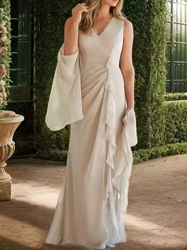 This elegant mother of the bride dress features a flattering V-neckline and a sheath silhouette that enhances your natural shape. Crafted from lightweight chiffon, it offers graceful movement and comfort throughout the day. The ruched detailing adds texture and sophistication, while the sleeveless design ensures ease of wear. Its floor-length cut provides a timeless, formal look perfect for any wedding occasion.