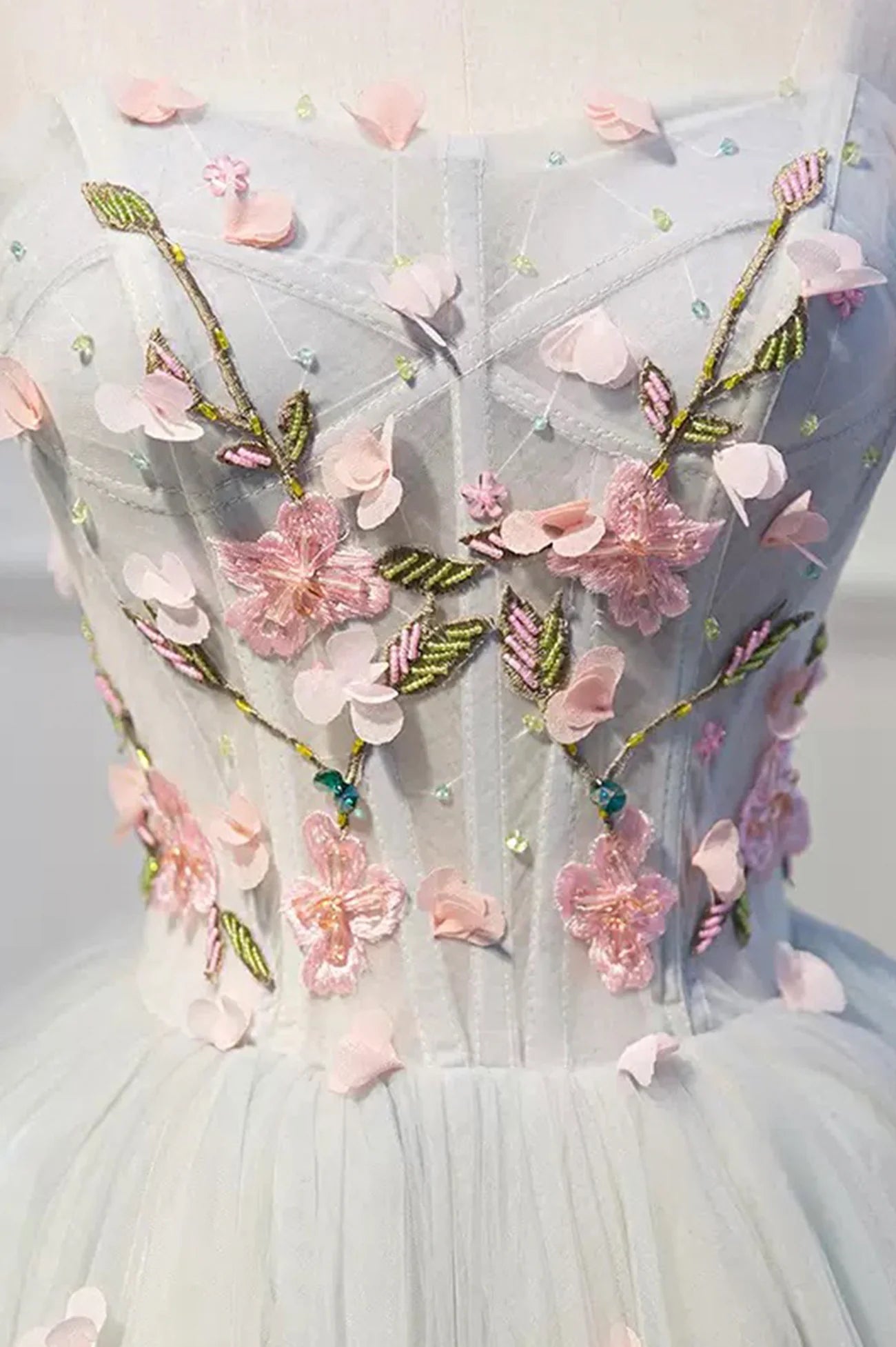 This A-line strapless prom dress features delicate tulle and intricate lace detailing, creating an elegant and timeless silhouette. Its knee-length design offers a perfect balance of sophistication and comfort, ideal for parties and special occasions. The structured bodice ensures a flattering fit, while the lightweight fabric allows ease of movement throughout your event. Perfect for those seeking a refined yet charming look.