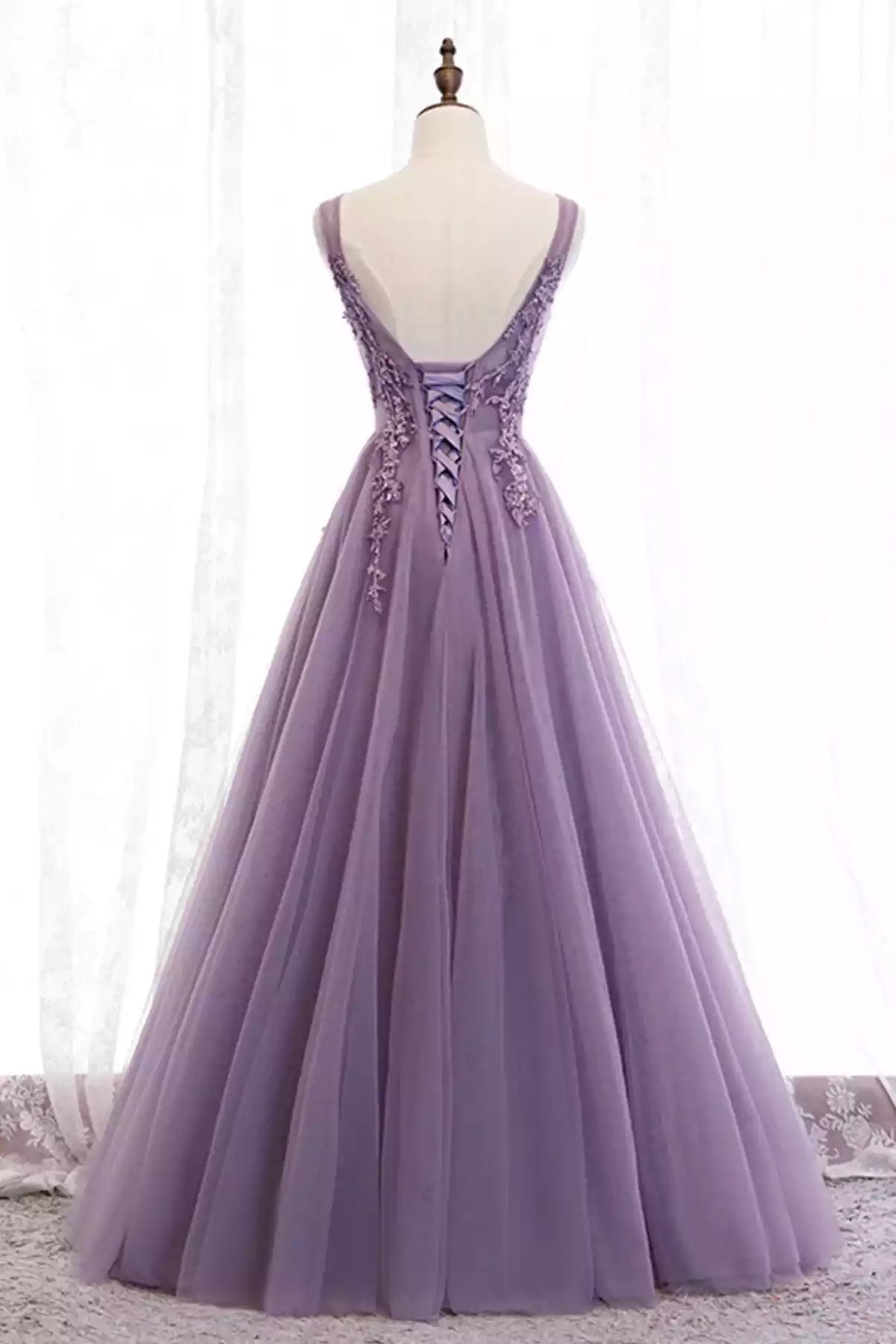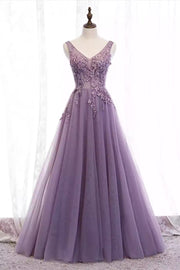 This elegant A-line prom dress features a flattering V-neckline and intricate lace detailing, creating a timeless silhouette perfect for evening events. The rich purple hue adds a regal touch, while the long length ensures graceful movement and sophistication. Ideal for prom or formal parties, this dress combines classic design with refined craftsmanship to make a memorable impression.