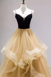 This elegant black party dress features a flattering V-neckline and delicate straps, designed to enhance your silhouette. Crafted with layered tulle, it offers a graceful floor-length flow that adds volume and movement. Perfect for prom or glamorous events, this dress combines sophistication with a modern touch, ensuring you stand out with timeless style and comfort.