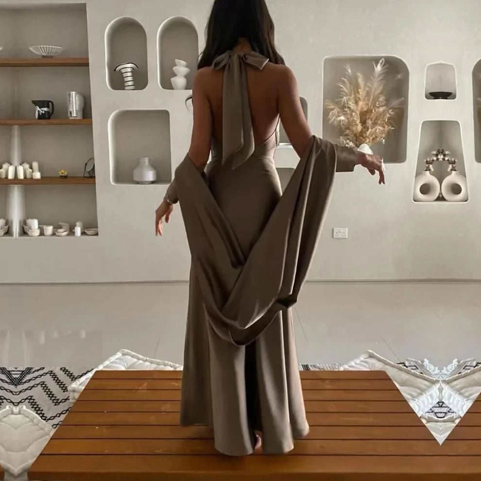 Elegant Satin Prom Dresses for Ladies Brown Halter Backless Satin Mermaid Party Dress Cocktail Dress Homecoming Dress Evening Dress