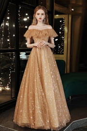 This elegant A-line prom dress features delicate tulle fabric and an off-the-shoulder design, creating a flattering silhouette that enhances your natural shape. Perfect for evening parties, its lightweight construction ensures comfort while maintaining a sophisticated look. Ideal for making a graceful statement at any formal event.