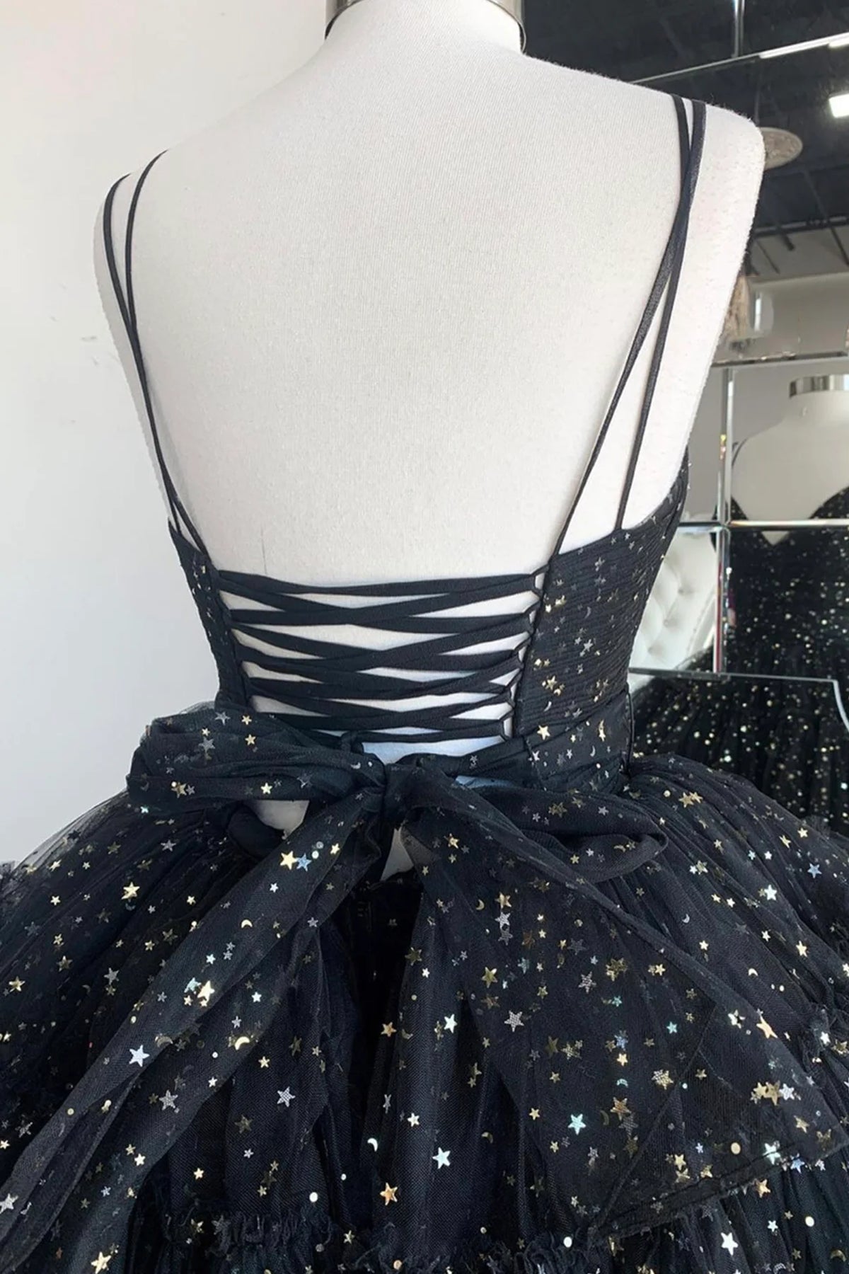 This elegant black prom dress features a flattering V-neckline and a high-low hemline that adds a modern twist to classic evening wear. Crafted from delicate tulle, it offers a lightweight and airy feel, perfect for dancing the night away. Its long length and sophisticated design make it an ideal choice for formal events and parties