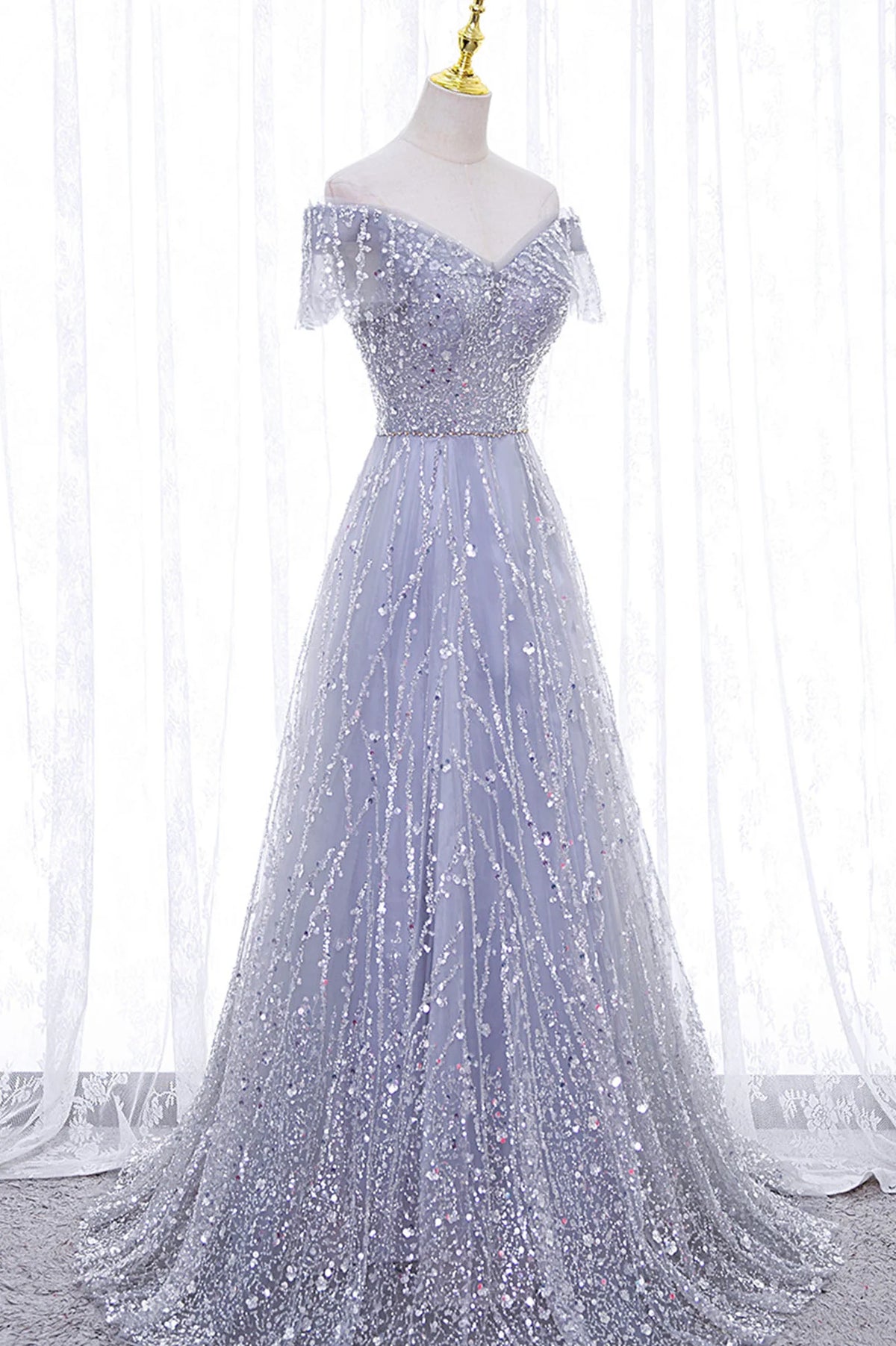 This off-the-shoulder A-line prom dress features delicate tulle fabric adorned with shimmering sequins, creating an elegant and flattering silhouette. Its long length and refined design make it an ideal choice for evening parties and formal events, combining comfort with sophisticated style.
