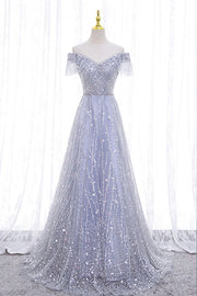 Off the Shoulder A-Line Tulle Sequins Long Prom Dress Evening Party Dress