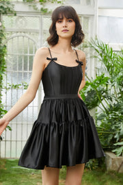 scoop sleeveless A-line dress features a trendy off-the-shoulder design that combines elegance and charm. Spaghetti Straps.Its flattering silhouette ensures comfort and confidence, making it an ideal choice for parties and special occasions. Crafted for a chic look, this short dress offers both style and ease, perfect for ladies seeking a fashionable yet effortless outfit.