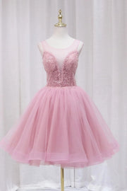Simple Pink A Line Round Neck Knee length Short Sleeveless Prom Dress Cocktail Dress Evening Dress Party Dress Homecoming Dress