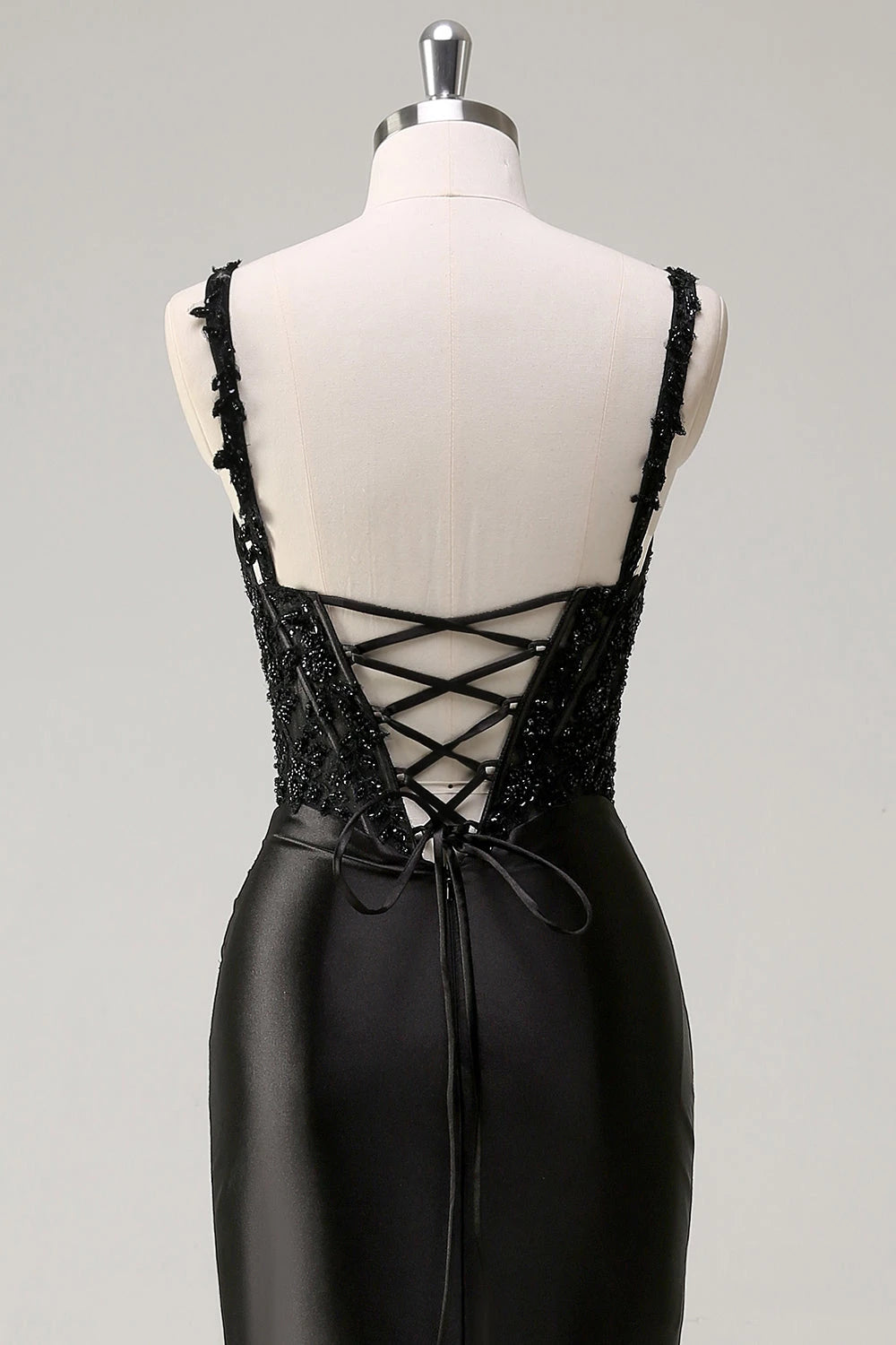 elegant floor-length prom dress features a sleek sheath silhouette with a shiny finish that catches the light beautifully. Spaghetti Straps,Corset,Beaded,Slit,The square neckline and off-the-shoulder design highlight the collarbones and shoulders with sophistication, while the sleeveless cut offers a modern, refined look. Perfect for formal occasions, this dress combines timeless style with a subtle shimmer to ensure you stand out with grace and confidence.