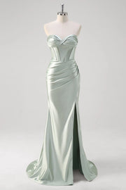 elegant floor-length party dress features a sweetheart neckline and sleeveless, off-the-shoulder design that beautifully frames the shoulders. Ruched,Corset,Slit.Crafted in a rich matcha hue, the mermaid silhouette enhances your natural curves for a graceful and striking appearance. Ideal for formal events, this dress offers a sophisticated fit that combines timeless style with modern flair.