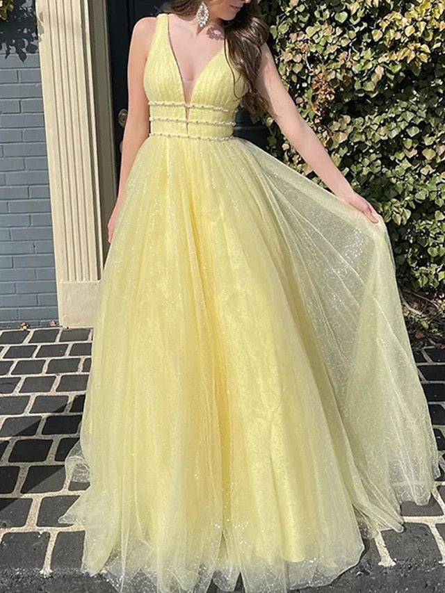 This elegant floor-length prom dress features a delicate tulle fabric adorned with shimmering sequins, creating a princess-like silhouette. The flattering V-neckline enhances the neckline while offering a sophisticated evening look. Perfect for formal events and parties, this dress combines timeless style with graceful movement, ensuring you stand out with refined charm.