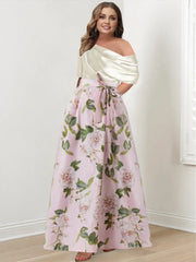 A-Line One-shoulder Short Sleeves Printed Flower Plus Size with Bow Belt Floor-Length Mother of the Bride Dresses