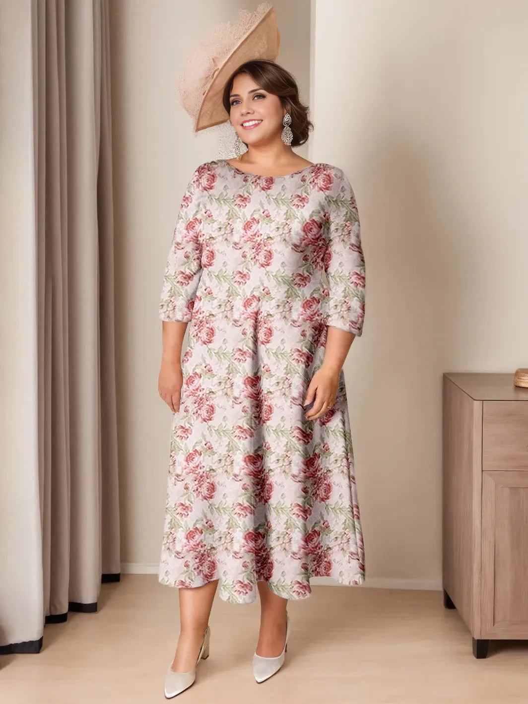 This elegant A-line dress features a scoop neckline and long sleeves, designed to flatter plus-size figures gracefully. The ankle-length silhouette is adorned with a delicate floral print, making it an ideal choice for mothers of the bride seeking a sophisticated and comfortable outfit for the special day. Its classic cut ensures ease of movement while maintaining a refined appearance.