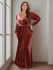 A-Line V-Neck Burgundy Long Sleeves Floor-Length Plus Size Velvet with Ruffles Mother of the Bride Dresses