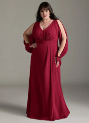 This captivating plus - size dress features an A line silhouette, offering a flowy and graceful look that flatters curves. The V neckline exudes romantic and charming vibes, while the cold shoulder long sleeves with tie details add a touch of feminine and delicate style. The zipper back detail brings a practical and neat element, and the floor length skirt creates a truly captivating and unforgettable style, perfect for bridesmaid duties.