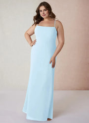 This charming plus size dress features a sheath silhouette, offering a sleek and body hugging look that flatters curves. The square neckline exudes classic and refined vibes, while the spaghetti straps add a touch of delicate and dainty style. The open back detail brings a stylish and alluring element, and the floor length skirt creates a truly charming and unforgettable style, perfect for bridesmaid duties.