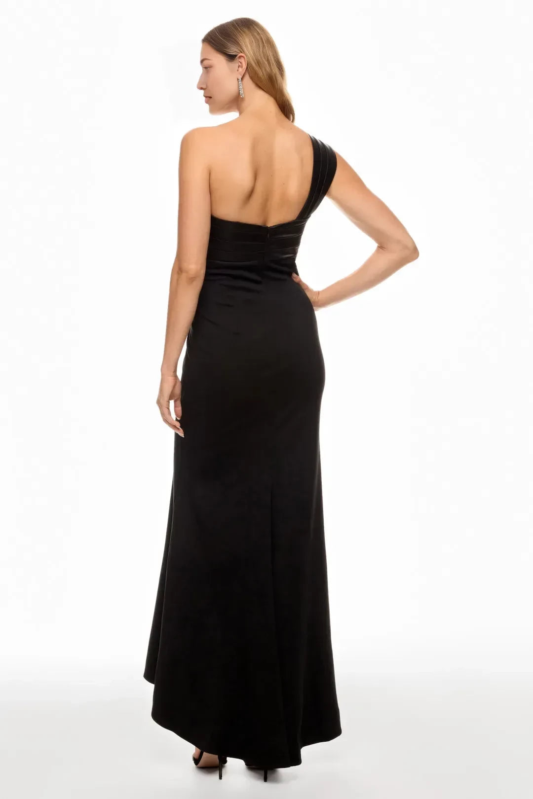 This prom dress features a mermaid silhouette. It has a one-shoulder neckline with sleeveless design. The bow accent and open-back style add chic charm, and the floor-length cut (available in plus sizes) is perfect for prom events. Structured fabric with elegant bow detailing creates a chic and sophisticated prom look.