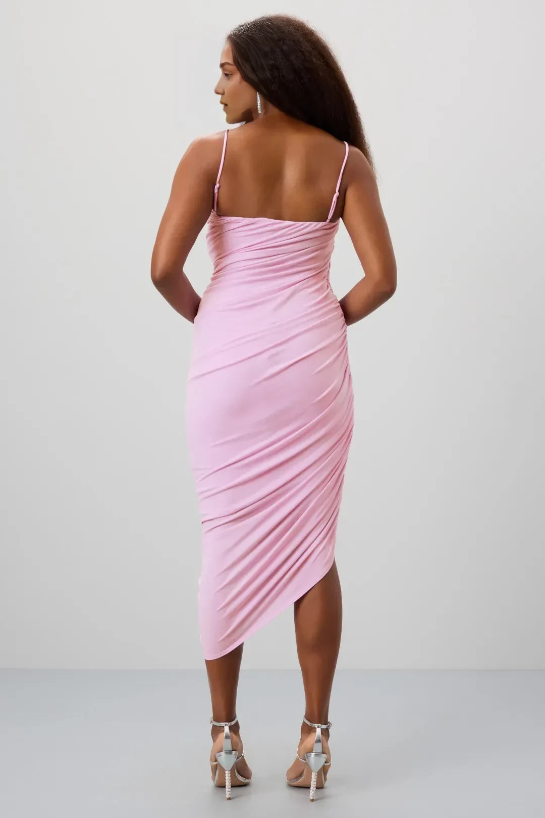 This prom dress features a sheath silhouette. It has a cowl neckline with sleeveless design. The ruched detailing and asymmetrical hem add chic charm, and the midi-length cut (available in plus sizes) is perfect for prom occasions. Stretchy fabric with elegant ruching creates a chic and sophisticated prom look.