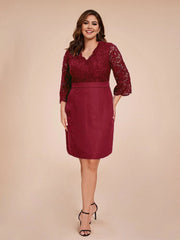 stylish Plus Size dress features a sheath silhouette, offering a sleek and form fitting look. The V neckline exudes chic charm, while the lace three - quarter sleeves add a touch of delicate elegance. The zip back design ensures a secure and comfortable fit, and the knee length skirt, with its combination of intricate lace and smooth fabric, creates a truly chic and unforgettable style, perfect for a mother of the bride at a wedding ceremony.