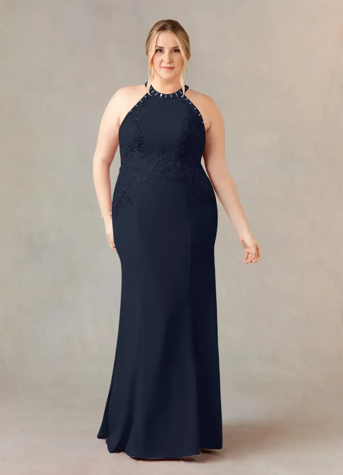 stylish Plus Size dress features a trumpet silhouette, offering a sleek and modern look. The halter neckline exudes chic charm, while the sleeveless design adds a touch of elegant allure. The lace back ensures a delicate and sophisticated fit, and the floor length skirt, with its smooth fabric and intricate lace detailing on the bodice, creates a truly chic and unforgettable style, perfect for a mother of the bride at a wedding ceremony.