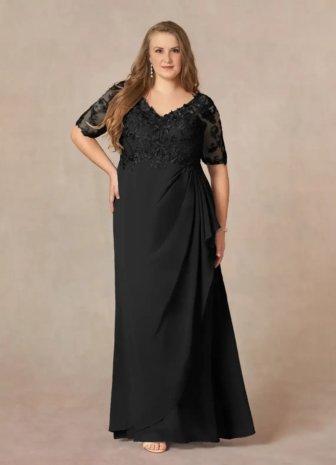 refined dress features an A line silhouette, offering a flowing and elegant look. The V neckline, paired with intricate lace detailing on the bodice and three quarter sleeves, exudes elegant charm. The zip back ensures a secure fit, and the floor length skirt, with its smooth fabric and draped side detail, creates a truly elegant and unforgettable style, perfect for a mother of the bride at a wedding ceremony.