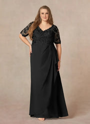 Luxury A Line V Neck Three Quarter Lace Sleeve Zip Back Plus Size Floor Length Mother of the Bride Dress