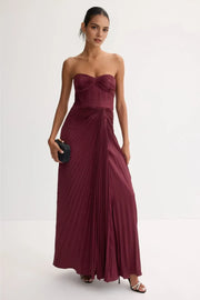 This prom dress features a mermaid silhouette. It has a strapless neckline with sleeveless design. The pleated-bodice style adds elegant charm, and the floor-length cut (available in plus sizes) is perfect for prom events. Flowing fabric with structured pleats creates an elegant and sophisticated prom look.