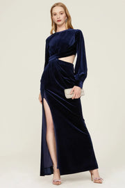 This prom dress features a sheath silhouette. It has a boat neckline with puff sleeves. The cutout waist detailing, velvet fabric, and floor-length cut (available in plus sizes) exude elegant charm, making it perfect for prom events. Luxurious velvet with tasteful cutout accents creates an elegant and sophisticated prom look.