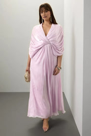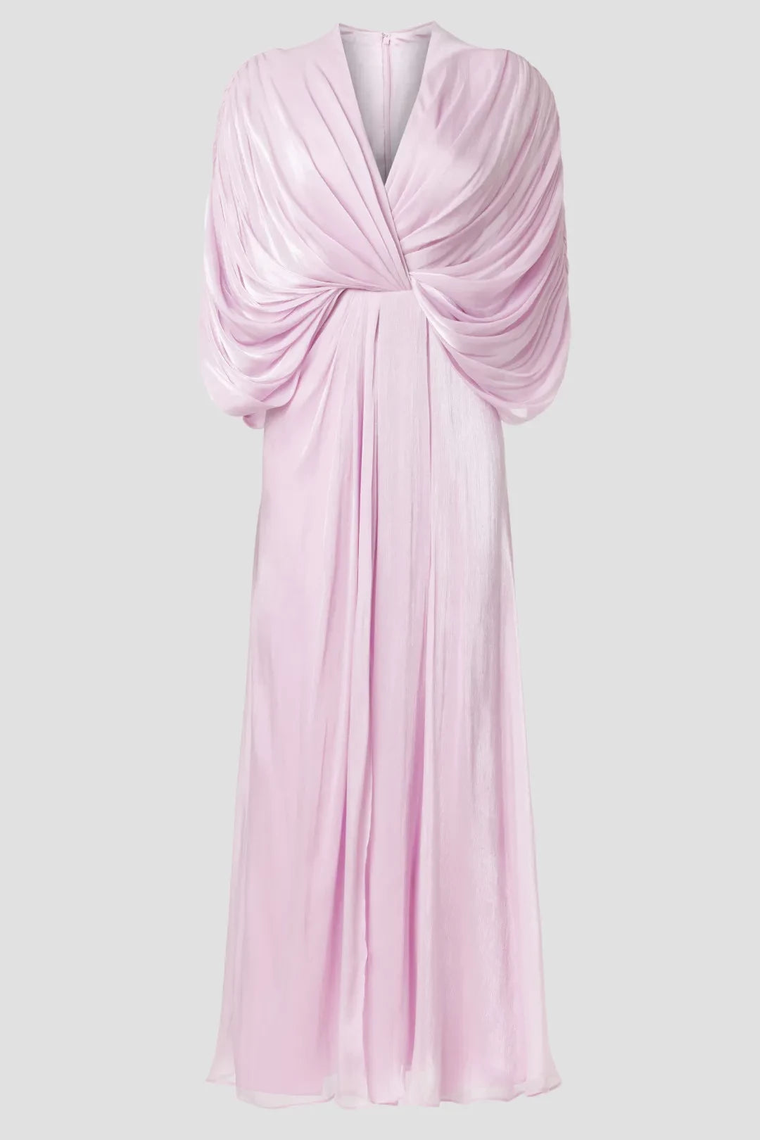 This prom dress features an A-line silhouette. It has a plunge neckline with draped sleeves. The flowing fabric and dramatic draping add ethereal charm, and the floor-length cut (available in plus sizes) is perfect for prom events. Lightweight fabric with elegant draping creates an ethereal and sophisticated prom look.