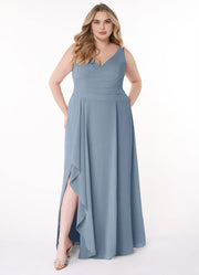 This gorgeous plus size dress features an A line silhouette, offering a flowy and graceful look that flatters curves. The V neckline exudes romantic and charming vibes, while the sleeveless design adds a touch of elegance. The zipper back detail brings a practical and neat element, and the floor length skirt with a high side slit creates a truly gorgeous and unforgettable style, perfect for bridesmaid duties.