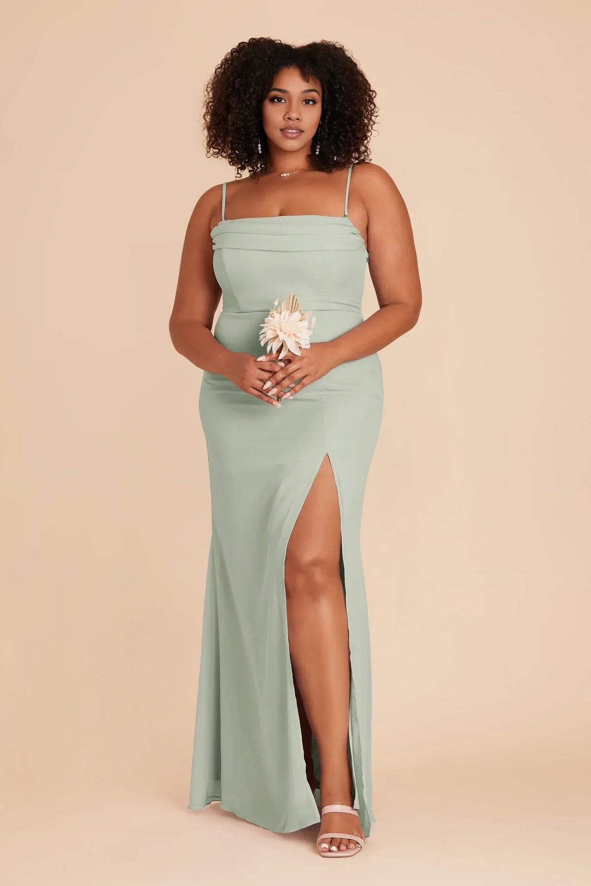This gorgeous plus size dress features a sheath silhouette, offering a sleek and body hugging look that beautifully flatters curves. The cowl neckline exudes soft charm, while the spaghetti straps add a touch of delicate elegance. The open back detail brings a stylish and alluring element, and the floor length skirt with a side slit creates a truly gorgeous and unforgettable style, perfect for bridesmaid duties.