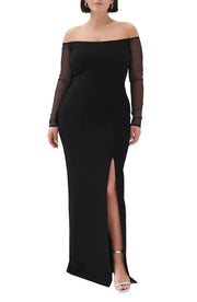 This gorgeous plus size dress features a sheath silhouette, hugging the body beautifully to highlight curves. The off the shoulder neckline gives off a romantic and alluring vibe. The mesh long sleeves add a touch of elegance and mystery, while the zipper back detail brings a practical and stylish element. The floor length skirt with a side slit creates a truly gorgeous and unforgettable look, perfect for evening events.