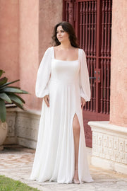Celebrate your love in this graceful plus size A line wedding dress. The square neckline offers a timeless charm, and the long sleeves bring an elegant and cozy feel. The button back detail adds a classic touch, while the floor length skirt flows beautifully, ensuring you feel poised and beautiful as you walk down the aisle on your wedding day.