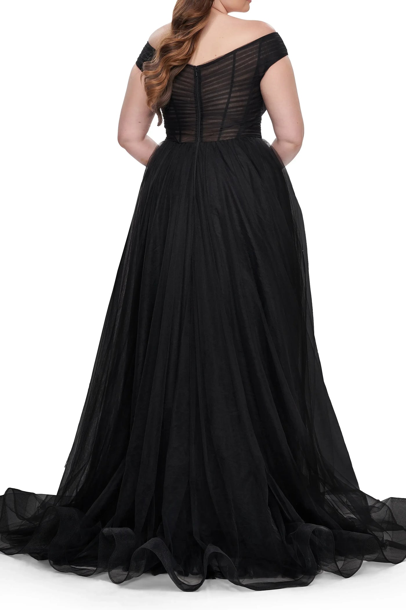 This graceful plus size dress features a ball gown silhouette, with a voluminous skirt that flows beautifully for a poised and charming look. The off shoulder design showcases the shoulders elegantly, adding a touch of romantic allure. With short sleeves, it offers a delicate and stylish appearance. The zipper back detail ensures a secure and seamless fit, and the floor length skirt, made of airy tulle, makes for a truly graceful and unforgettable appearance, perfect for evening events.
