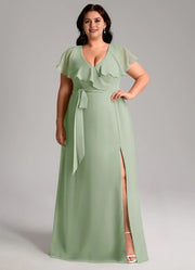 This lovely dress features an A line silhouette, offering a flowy and graceful look. The V neckline exudes charming and elegant vibes, while the flutter sleeves add a touch of delicate and airy style. The open back detail brings a stylish and alluring element, and the floor length skirt with a high side slit creates a truly lovely and unforgettable style, perfect for bridesmaid duties. It comes in plus sizes to ensure a great fit for all body types.
