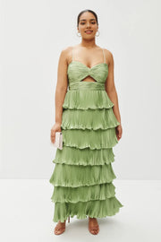 This prom dress features a sheath silhouette. It has a sweetheart neckline with sleeveless design. The tiered ruffle skirt and cutout detail add romantic charm, and the floor-length cut (available in plus sizes) is perfect for prom events. Flowing fabric with layered ruffles creates a romantic and sophisticated prom look.