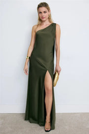 This prom dress features a mermaid silhouette. It has an asymmetric neckline with sleeveless design. The tie-back and side-slit style add stunning charm, and the floor-length cut (available in plus sizes) is perfect for prom events. Satin-like fabric with elegant draping creates a stunning and sophisticated prom look.