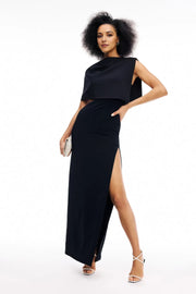This prom dress features a sheath silhouette. It has a cowl neckline with sleeveless design. The open-back and side-slit style add stylish charm, and the floor-length cut (available in plus sizes) is perfect for prom events. Draped fabric with elegant details creates a stylish and sophisticated prom look.