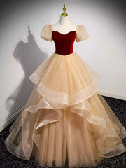 This A-line prom dress combines the softness of velvet with the delicate texture of tulle, creating an elegant and charming silhouette. Featuring short sleeves and a long, flowing skirt, it offers a flattering fit that enhances your natural shape while ensuring comfort throughout formal occasions. Ideal for prom or special events, this dress balances classic design with a youthful, cute appeal.
