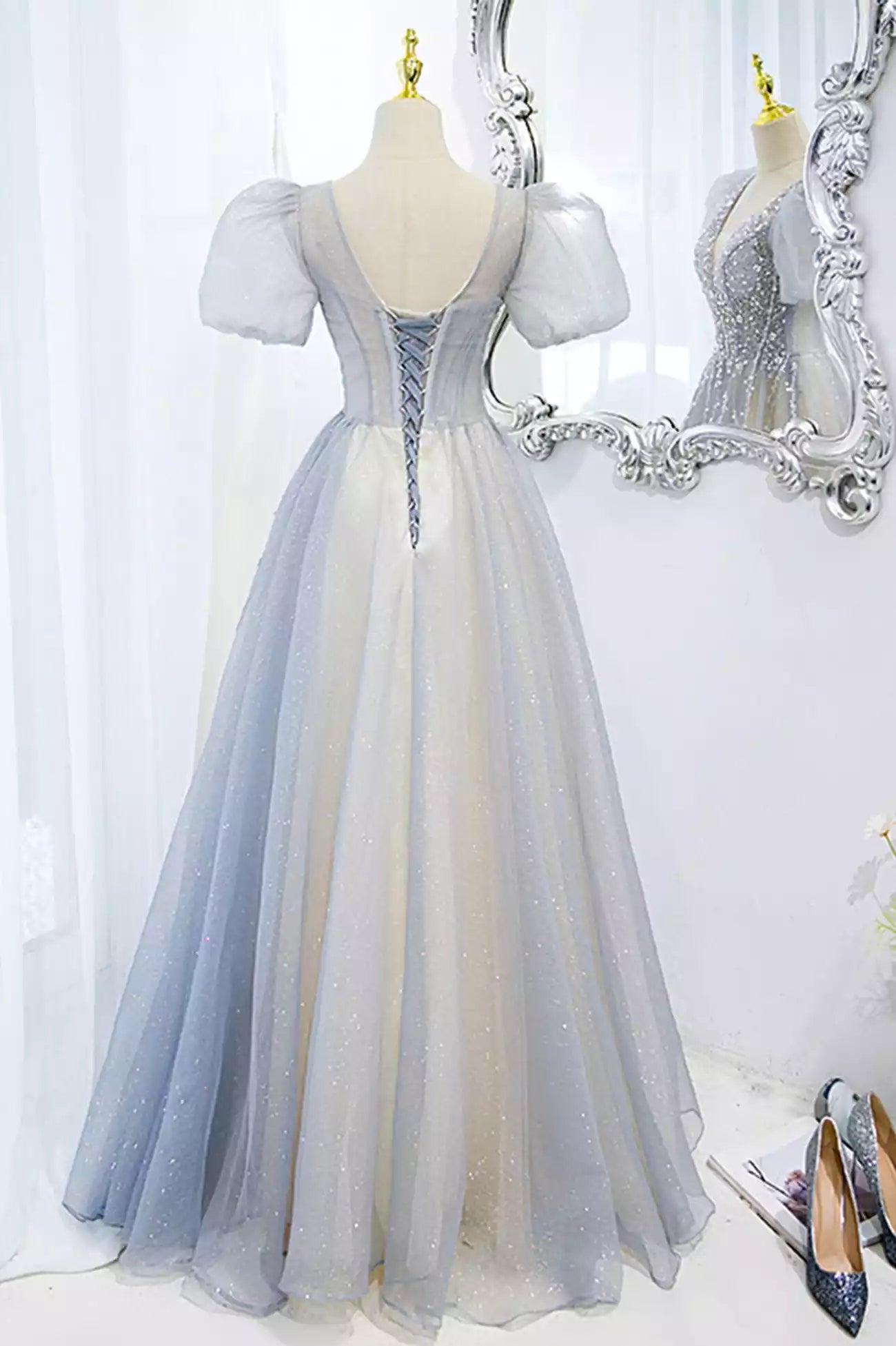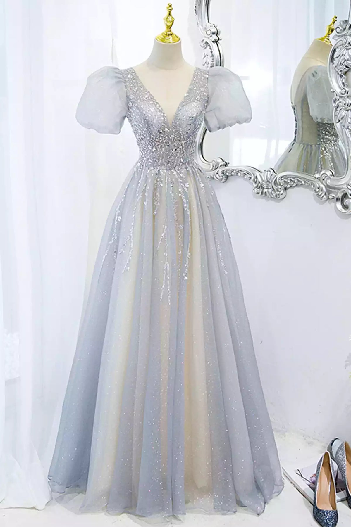 A-Line Short Sleeve Gray Tulle Beading Long Prom Dresses Formal Evening Dresses - US 2 / UK 6 / EU 32