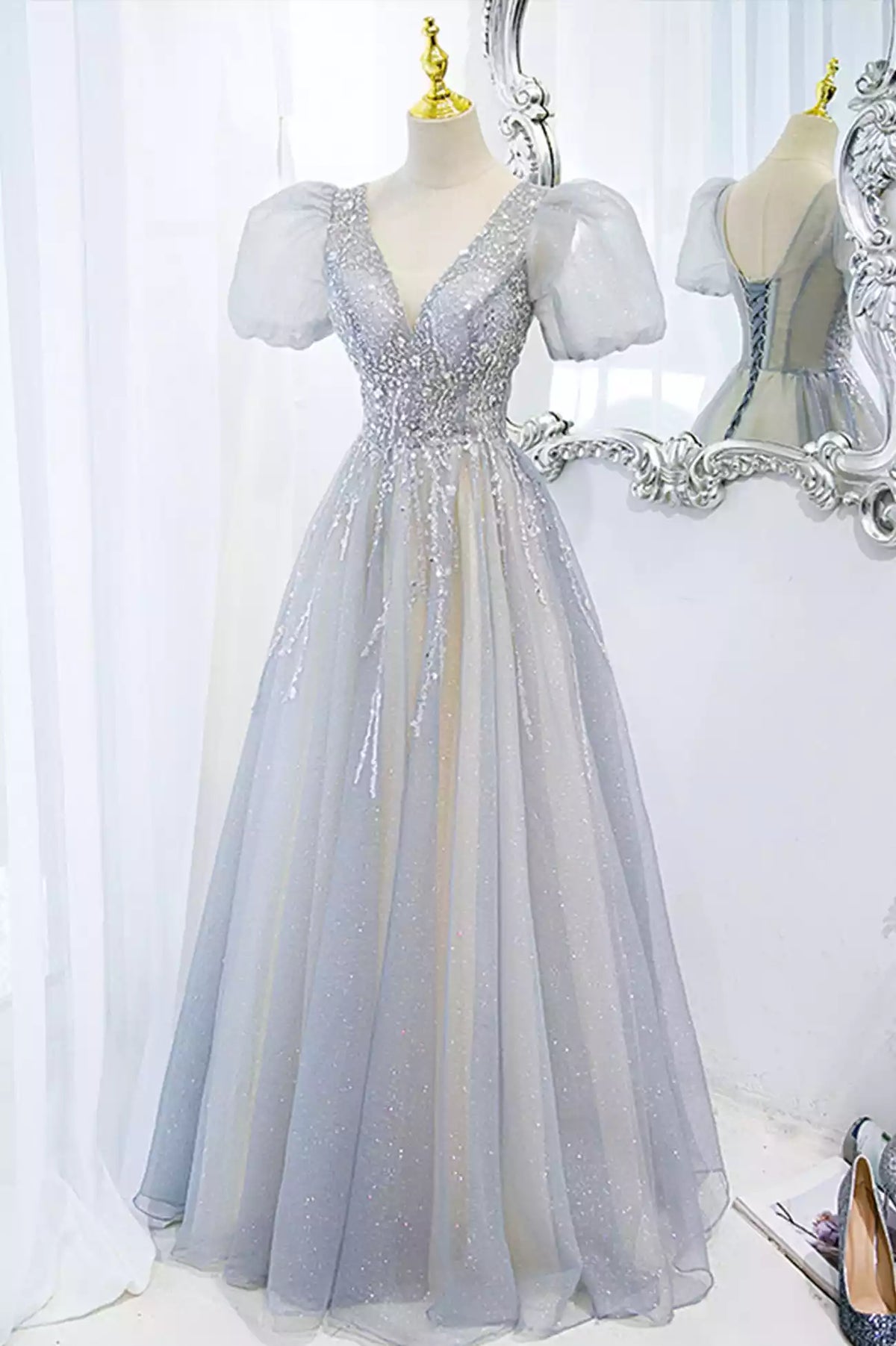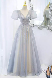 This elegant A-line prom dress features delicate short sleeves and a flowing gray tulle skirt, adorned with intricate beading for a refined touch. Its long silhouette offers a graceful presence, perfect for formal evening occasions. The combination of soft tulle and detailed embellishments ensures both comfort and sophistication, making it an excellent choice for memorable events.