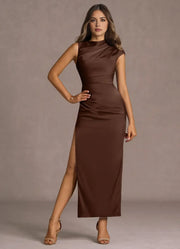 Asymmetric Shoulder Mock Neck Satin Sheath Ruched Bodice High Slit Midi Length Female Prom Dress