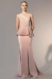 asymmetric, one-shoulder prom dress combines elegance and modern design with its sleeveless trumpet silhouette. The floor-length cut enhances sophistication, Pleated peplum, Fitted bodice making it ideal for formal events and special occasions. Its unique structure ensures a flattering fit that accentuates the figure while allowing comfortable movement. Perfect for women seeking a refined and distinctive look.