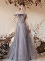 This elegant long prom dress features delicate gray tulle adorned with intricate beadwork, creating a sophisticated and shimmering effect. The off-the-shoulder design highlights the neckline gracefully, making it an ideal choice for evening parties and formal events. Crafted to combine comfort with style, this dress ensures you stand out with timeless elegance.