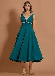 Beaded Trim A Line V Neck Sleeveless Deep V Back Midi Length For Sale Prom Dress
