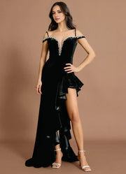 This prom dress features a mermaid silhouette with velvet fabric for a lush, polished look. The convertible shoulder (off-shoulder thin straps) adds a distinct flexible touch, while the beaded trim and ruffled side bring subtle sparkle. The train and high slit boost movement, making it ideal for prom events keeping the wearer confident and eye-catching.